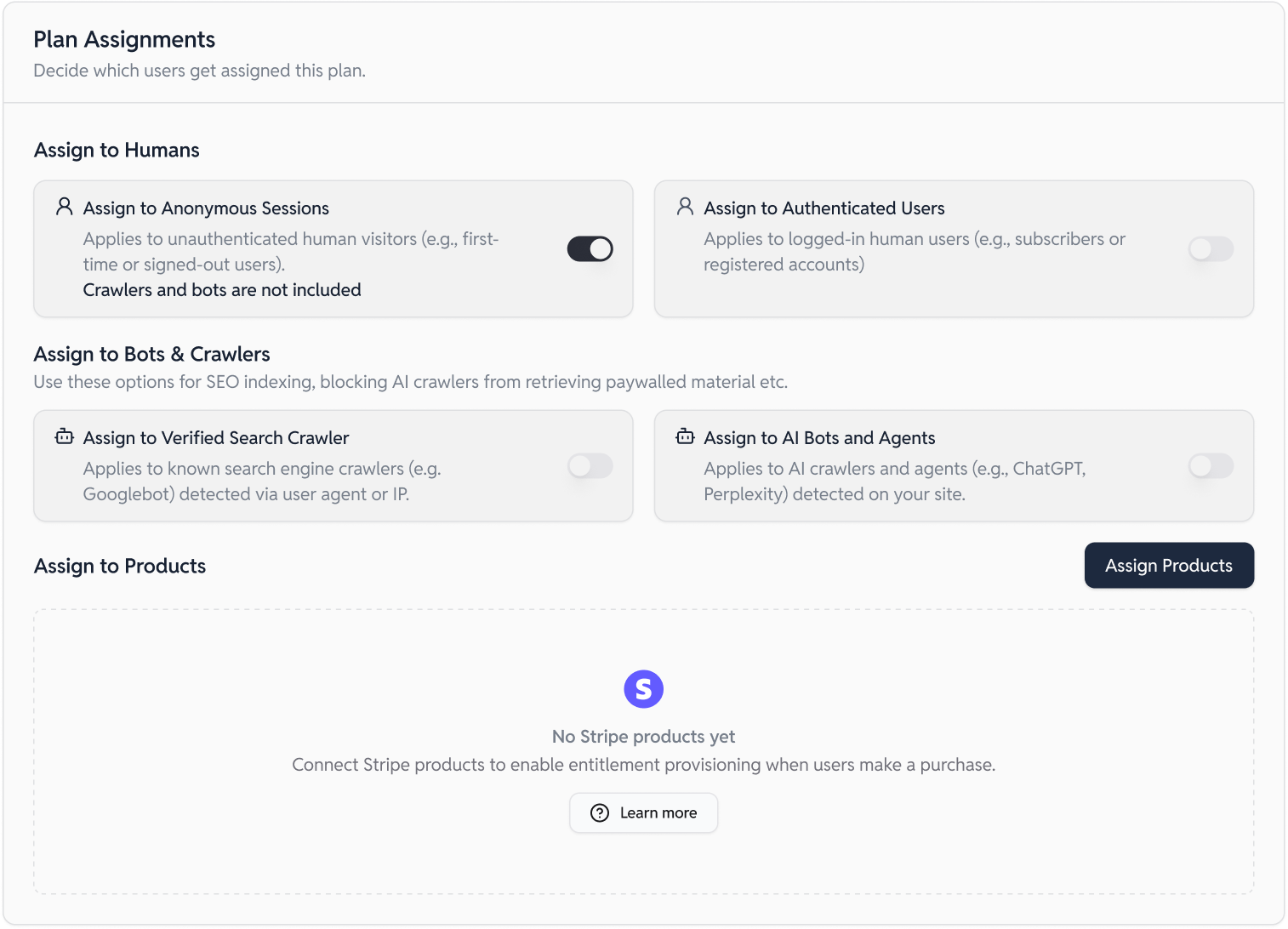 Plans clearly and explicitly define who gets access to what. They map directly to the mental model of how users think about access: “What do subscribers of gold get?”, “What do anonymous users see?” “How do we block access for bots?”